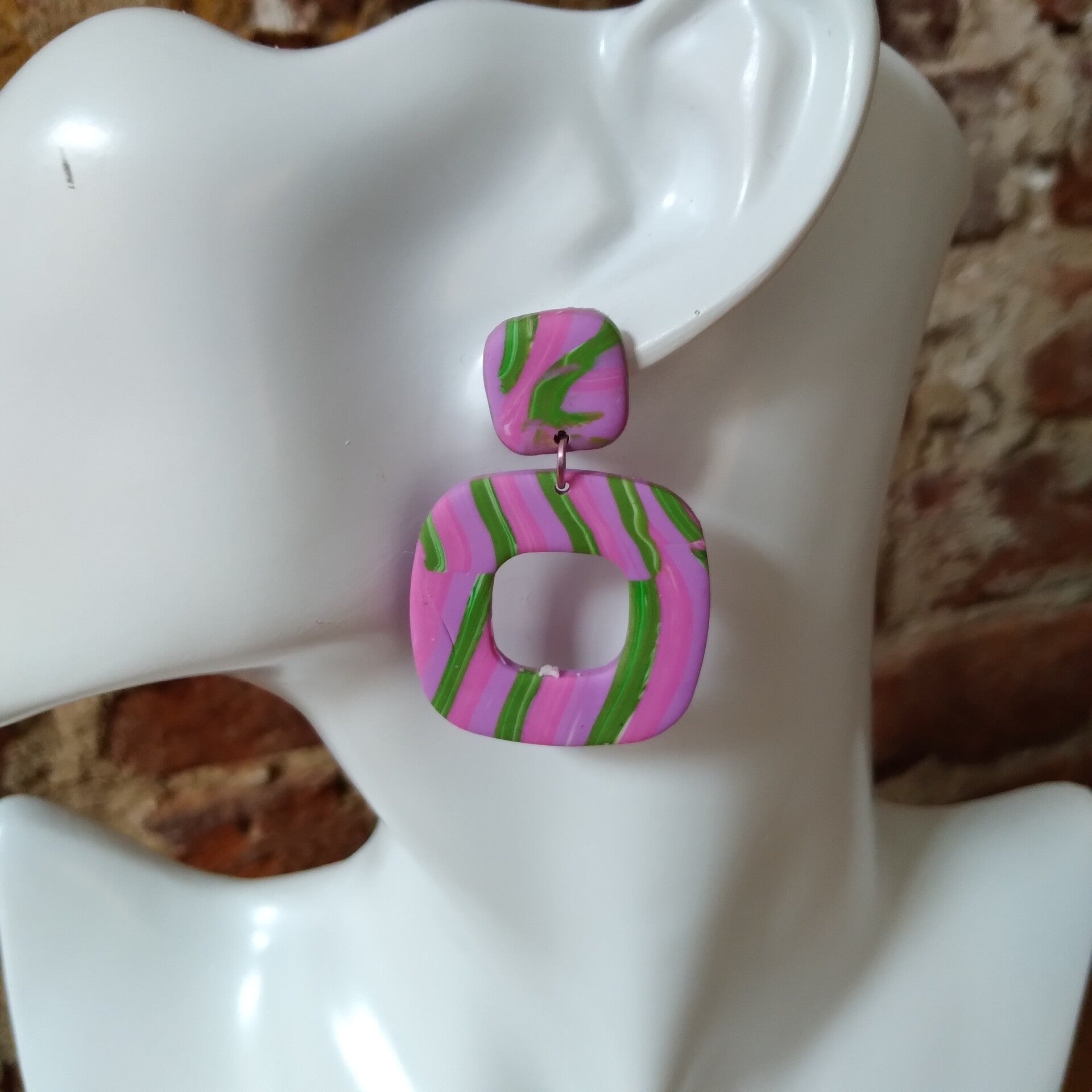 Statement oorbellen in roze met groenen print. 4,5 x3,5 cm