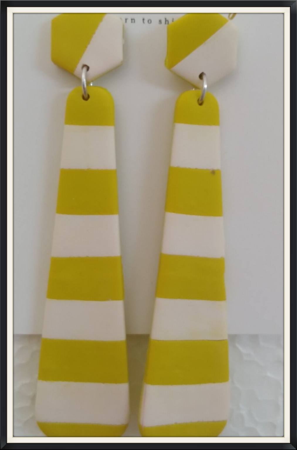 Statement oorbellen in wit met citroen geel gestreept. 8,5 x 2 cm