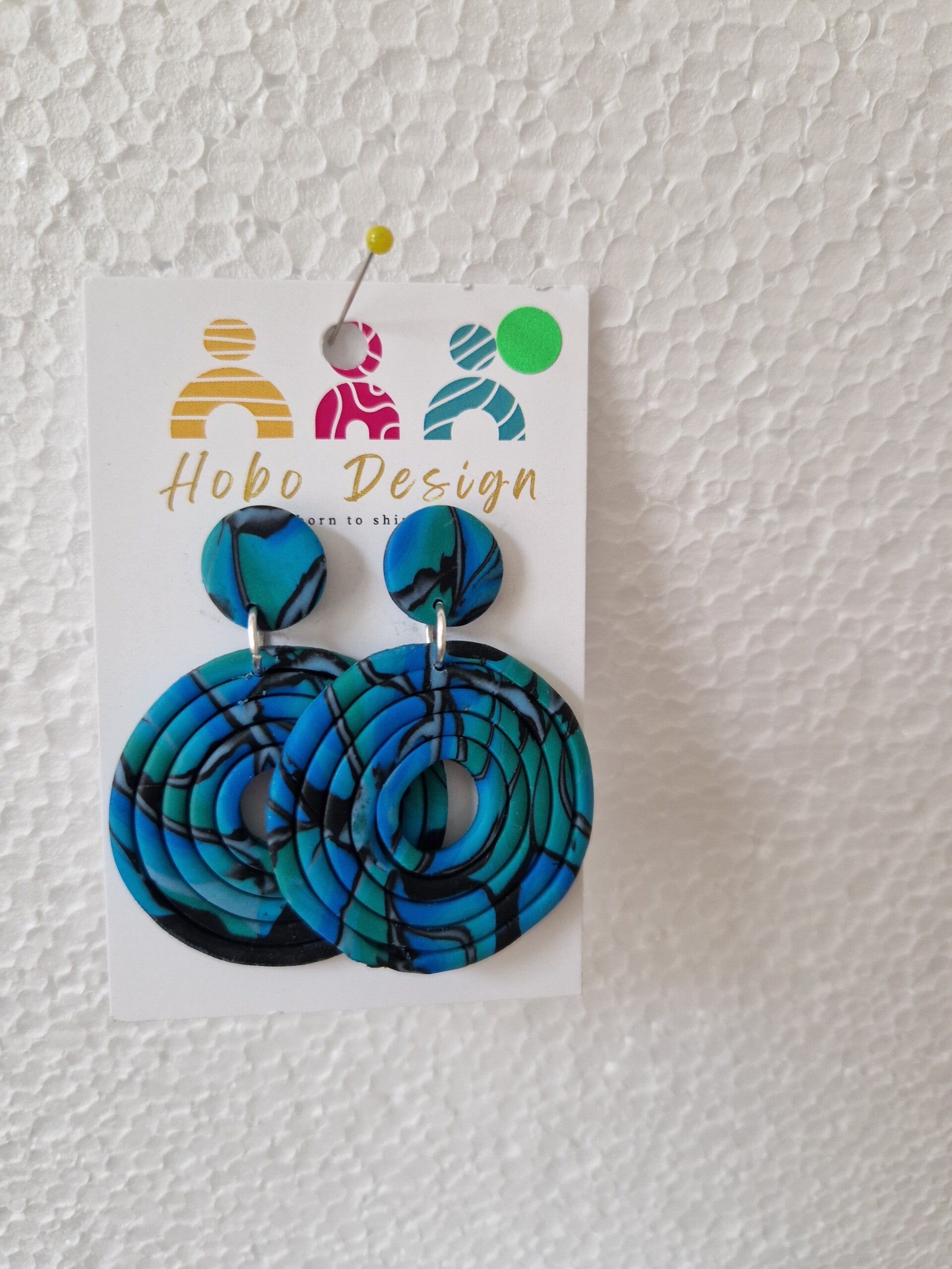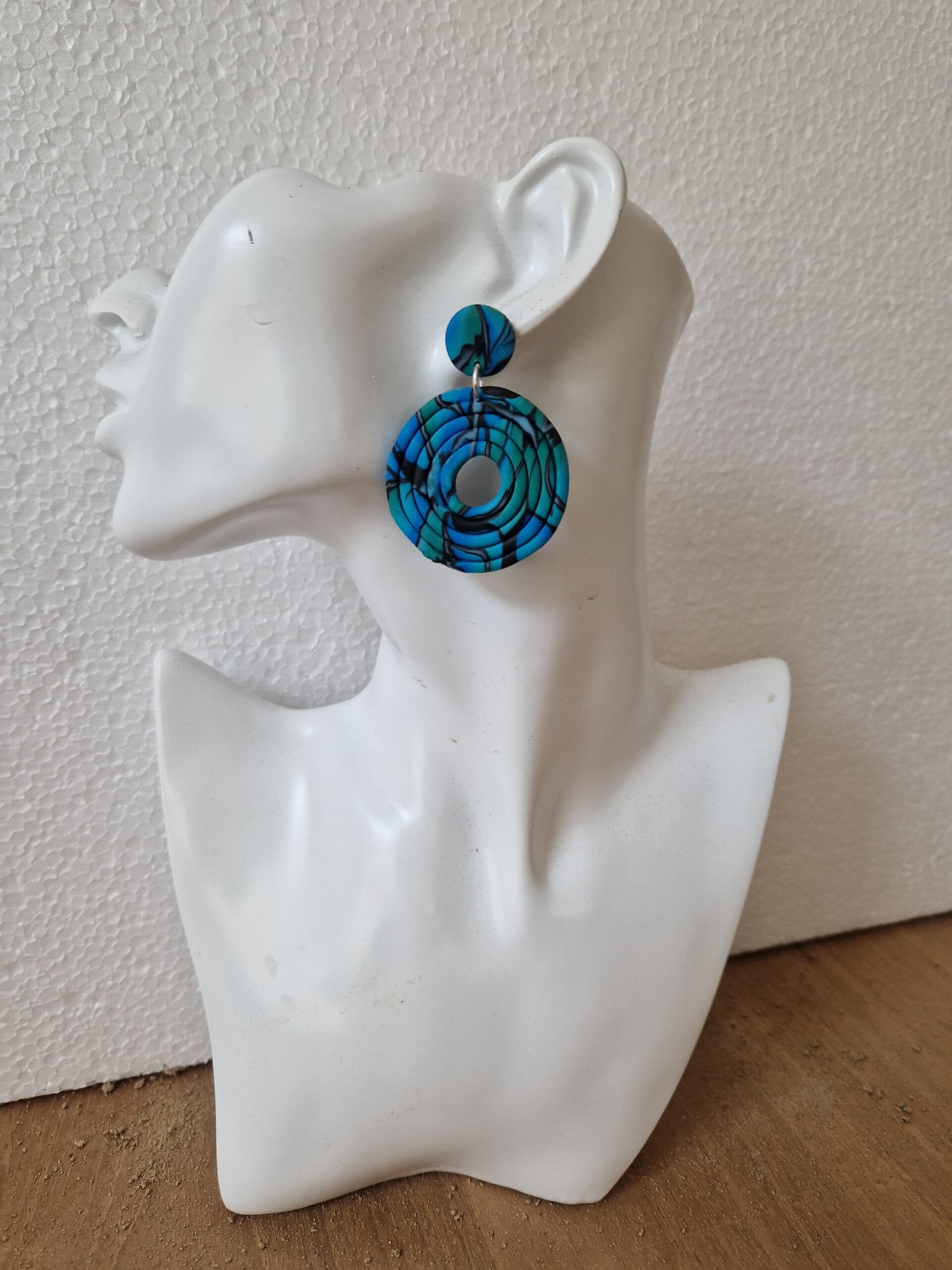 Prachtige statement oorbellen in blauw , groen met zwart dessin.