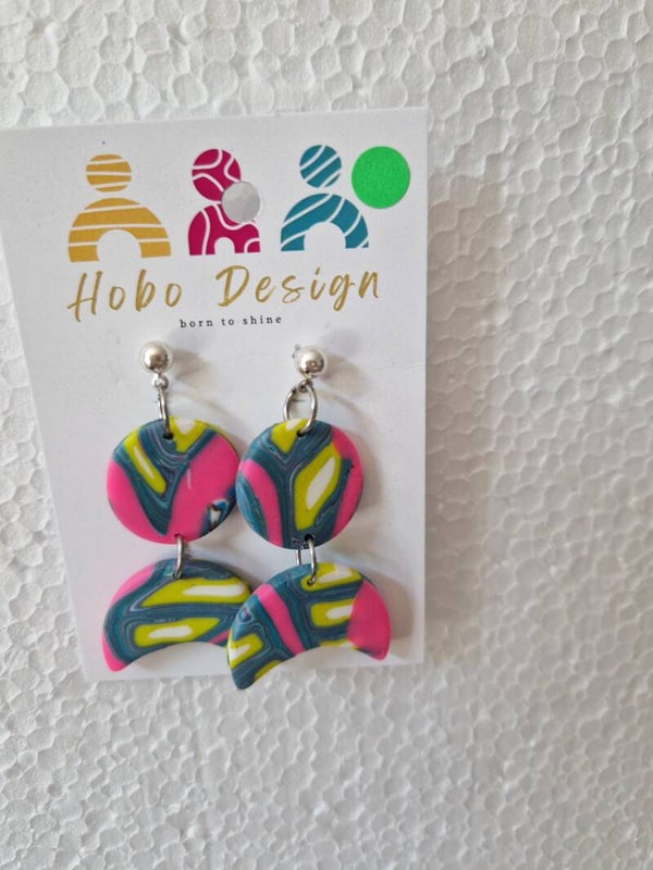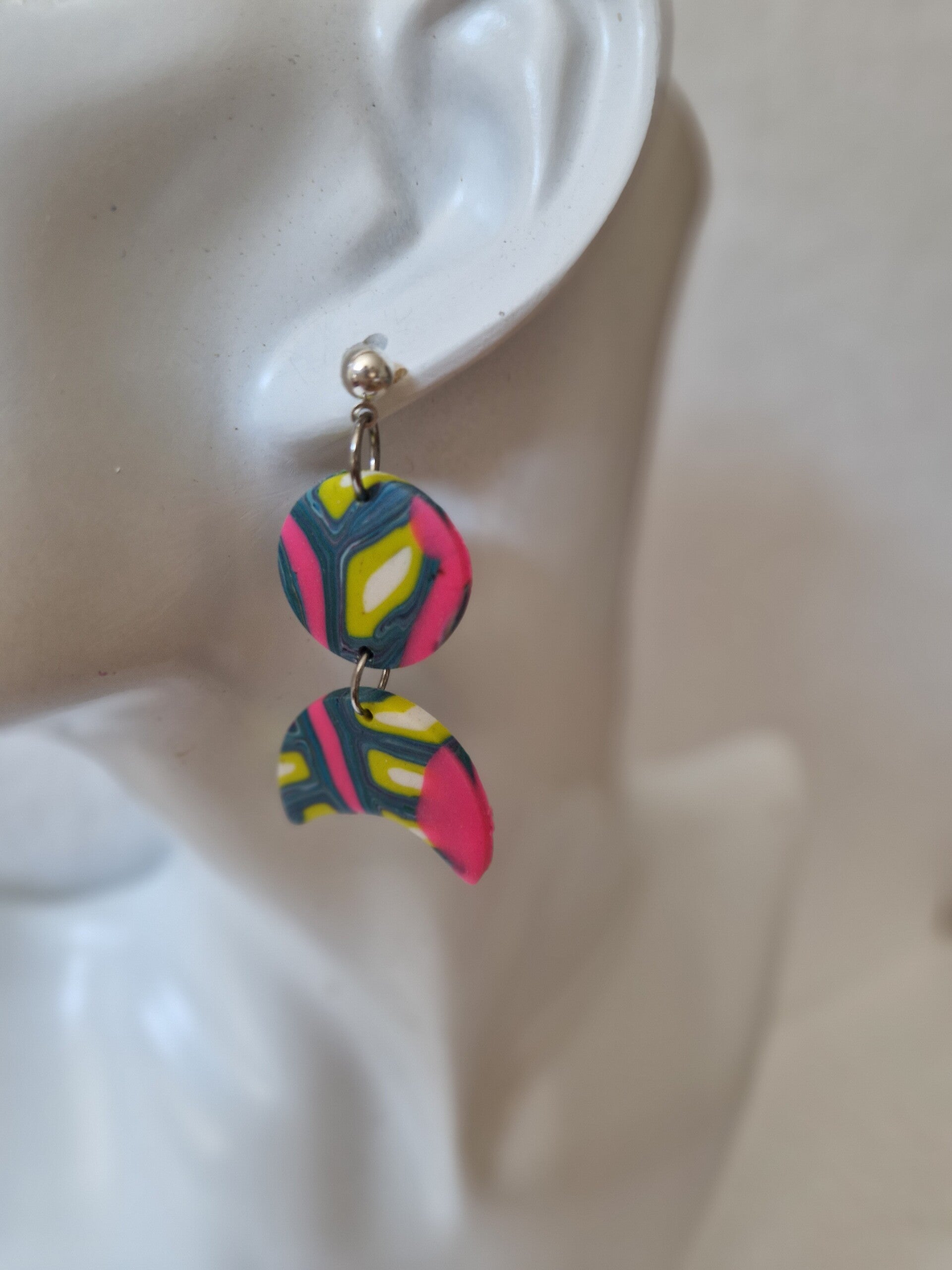 Deze leuke oorhanger in neon roze met geel en blauw dessin hangt aan een kleine zilverkeurige knop, handig bij meerdere oorgaatjes.