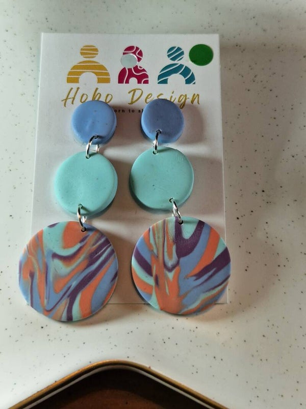 Statement oorbellen in zacht dessin van bosbessenpaars ,zalm en licht blauw.