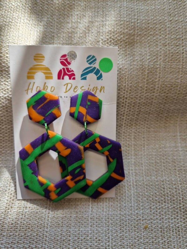 Zeskantige oorbellen in paars dessin.