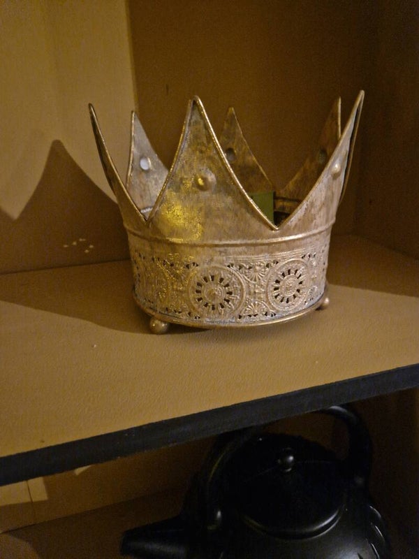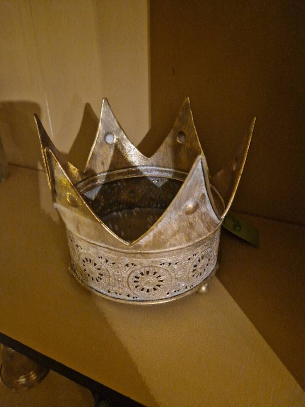 Deze kroon is in goud kleur, kan je gebruiken als kaarshouder of planmten pot of voor je kerst creatie. 20x16 cm