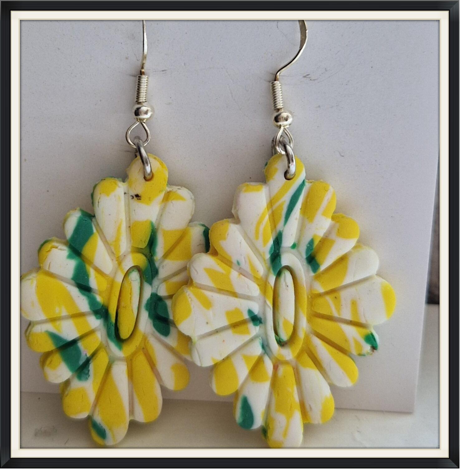 De oorbellen zijn met de hand gemaakt in eigen atelier, ze zijn van polymeer klei daardoor licht draagbaar en hebben een nikkel vrije oorsteker.