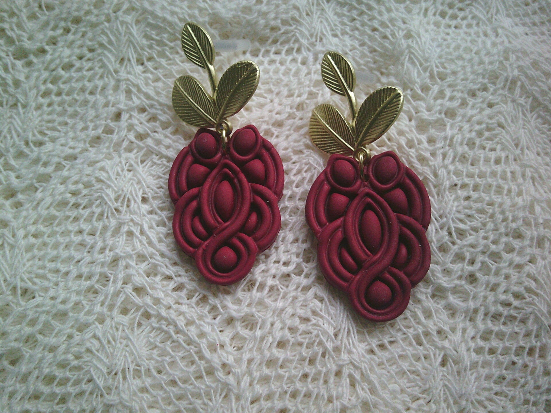 Prachtige oorhanger een gouden blad steker in bordeauxrood.
