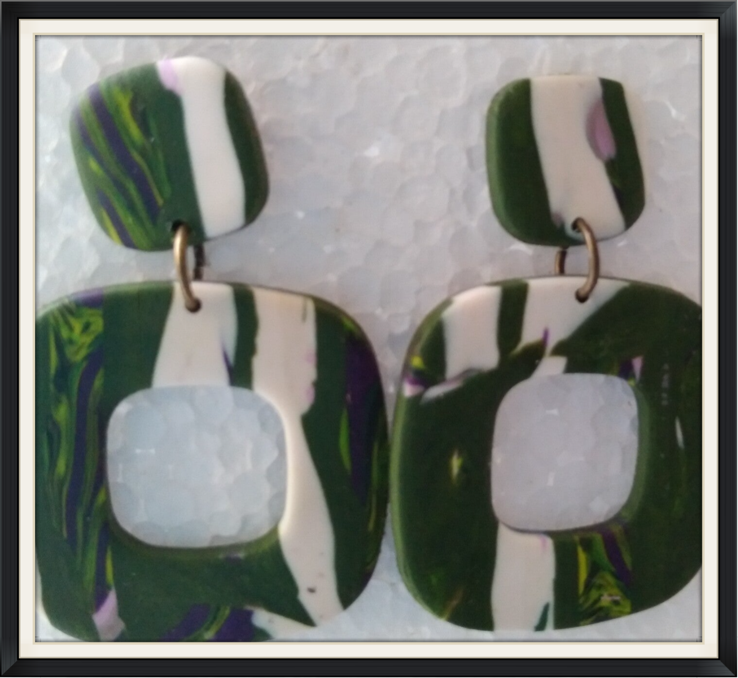 5,8x4,8 cm , mooie kleur groen met wit deze handgemaakte oorbellen van polymeerklei